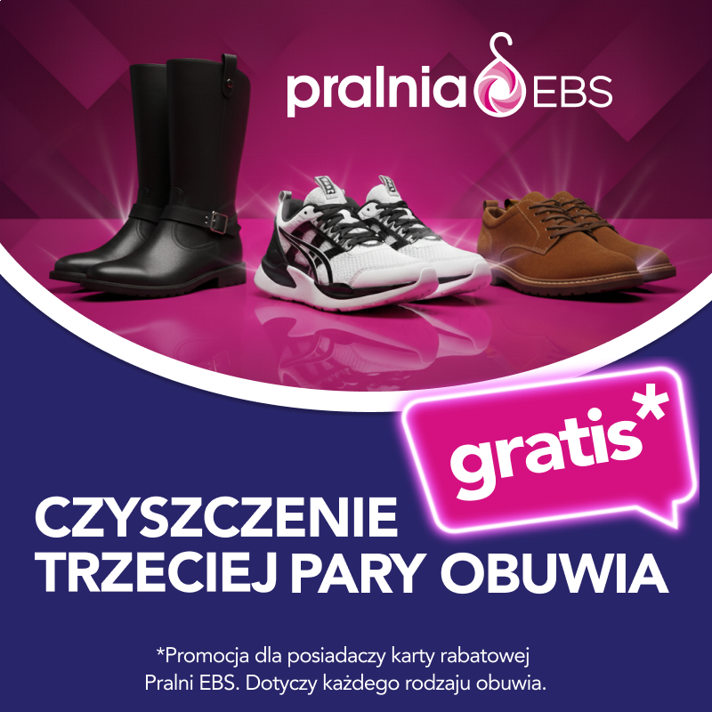 Od 1 grudnia 2025 do 15 stycznia 2026 trwa promocja: przy oddaniu minimum 3 par butów trzecia para (najtańsza) jest czyszczona gratis z kartą rabatową Pralni EBS.